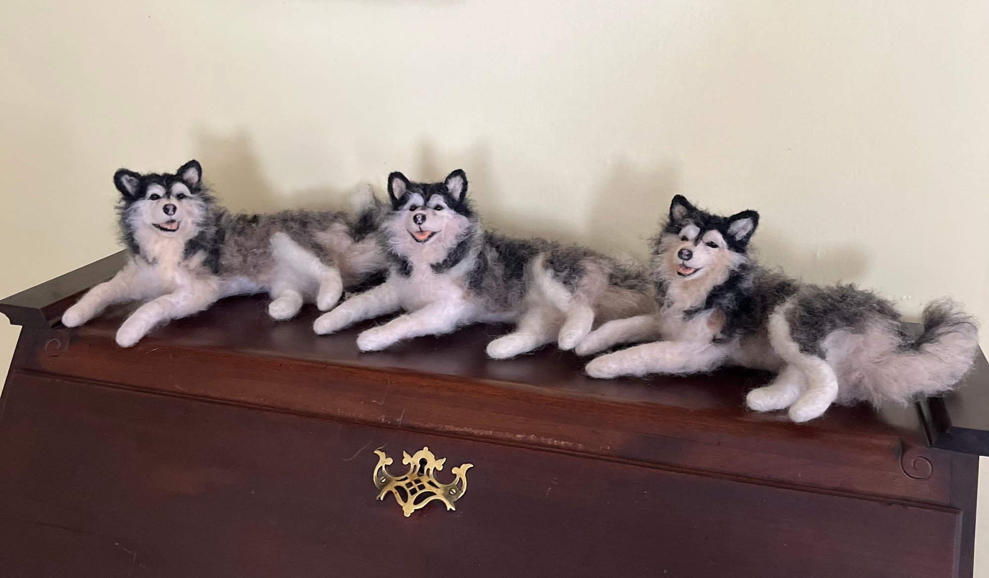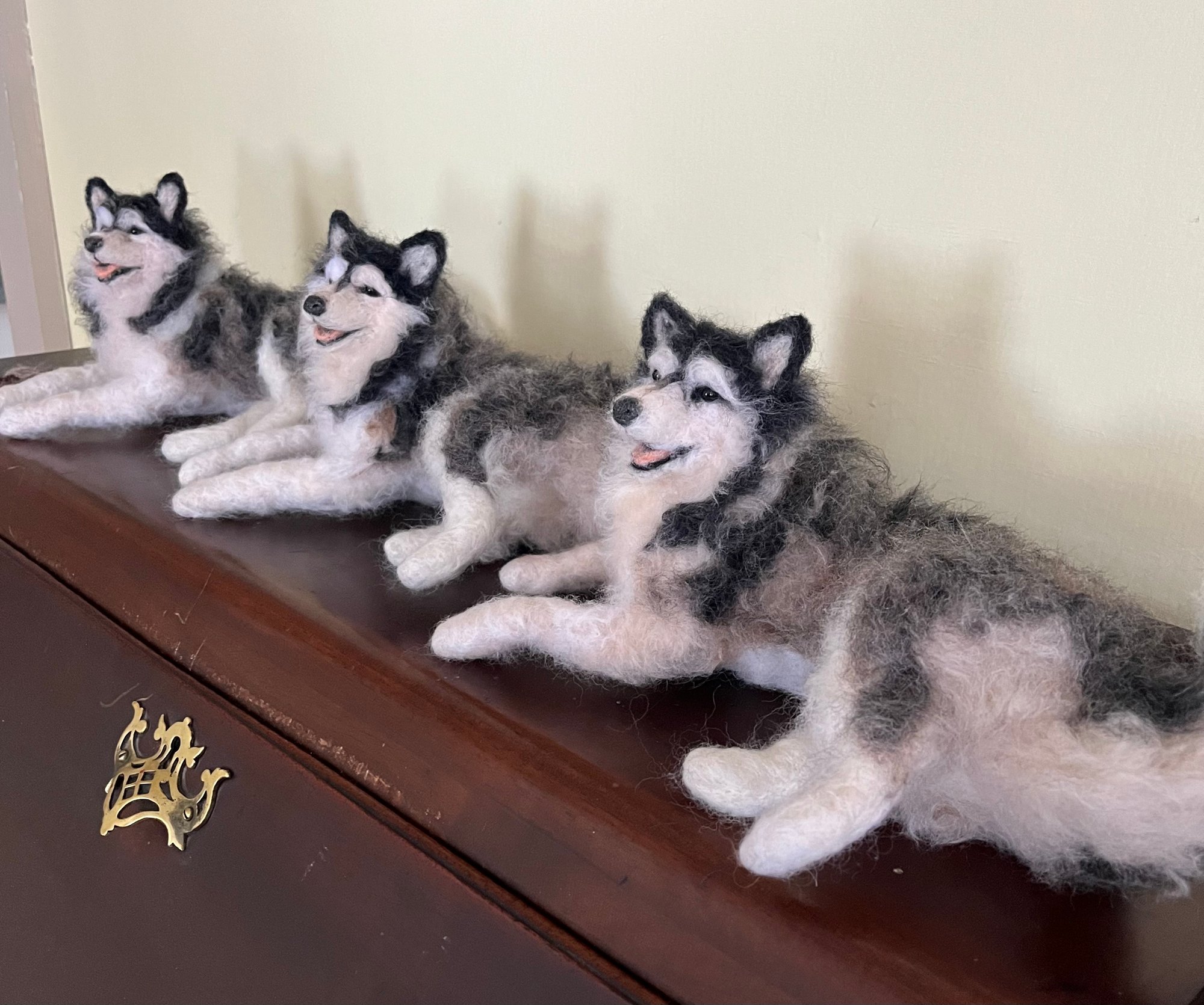 Felted husky that is made from armature wire,wool,wax nose and tongue.
