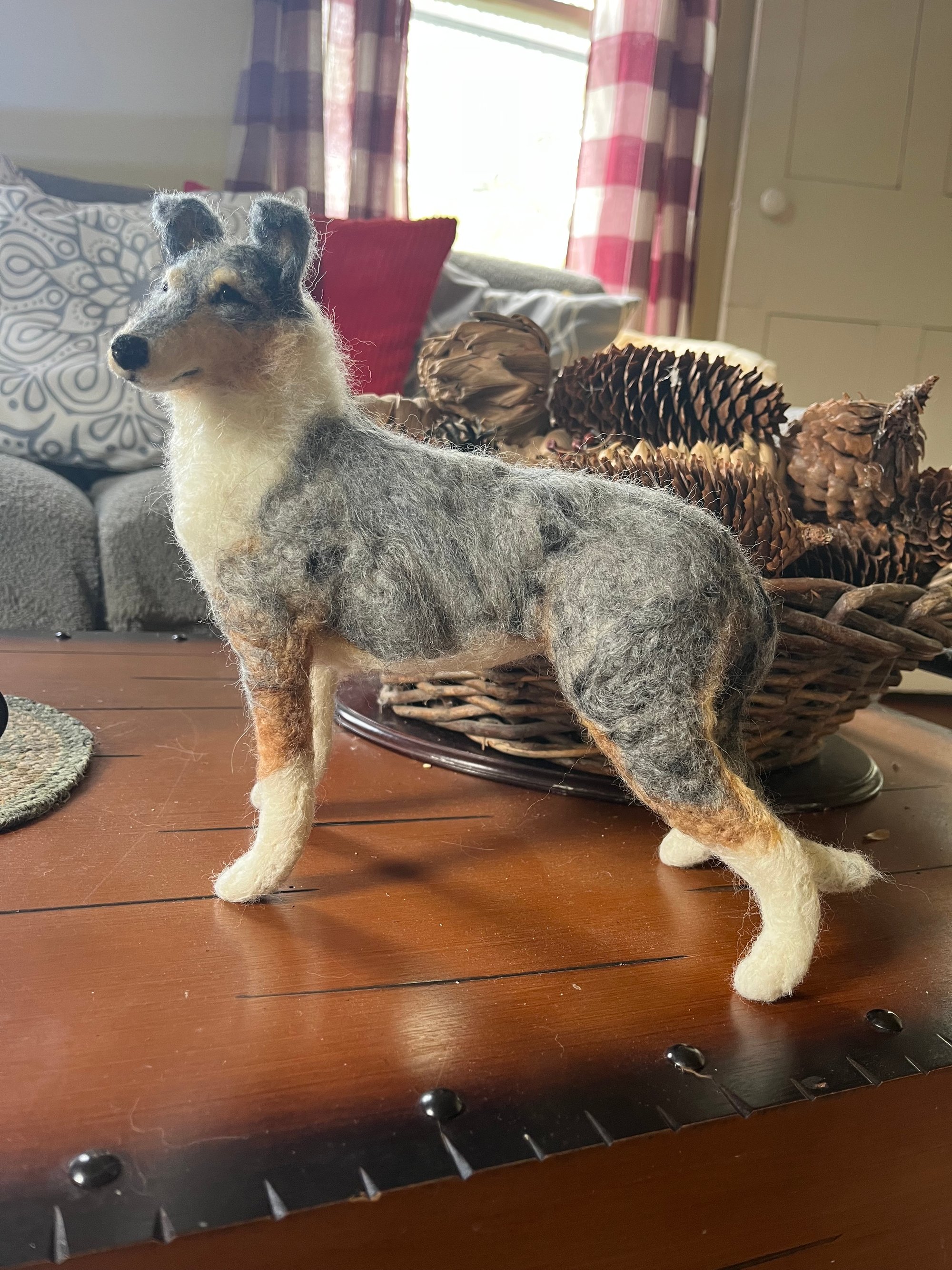 Needle felted 9" standing smooth collie made from seep wool.
