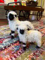 Two valais sheep. One 12” and one 10”. Made from wool locks,polymer clay horns and beeswax and hardener hooves.